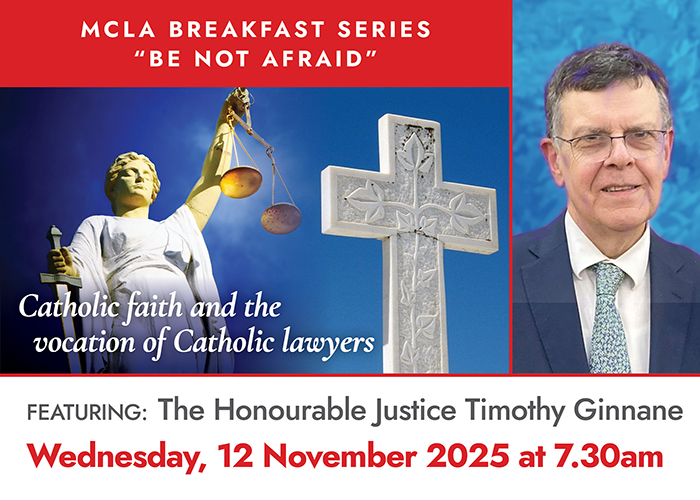 Our first speaker will be the Honourable Justice Tim Ginnane, who will speak on “Catholic Faith and the Vocation of Catholic Lawyers”.